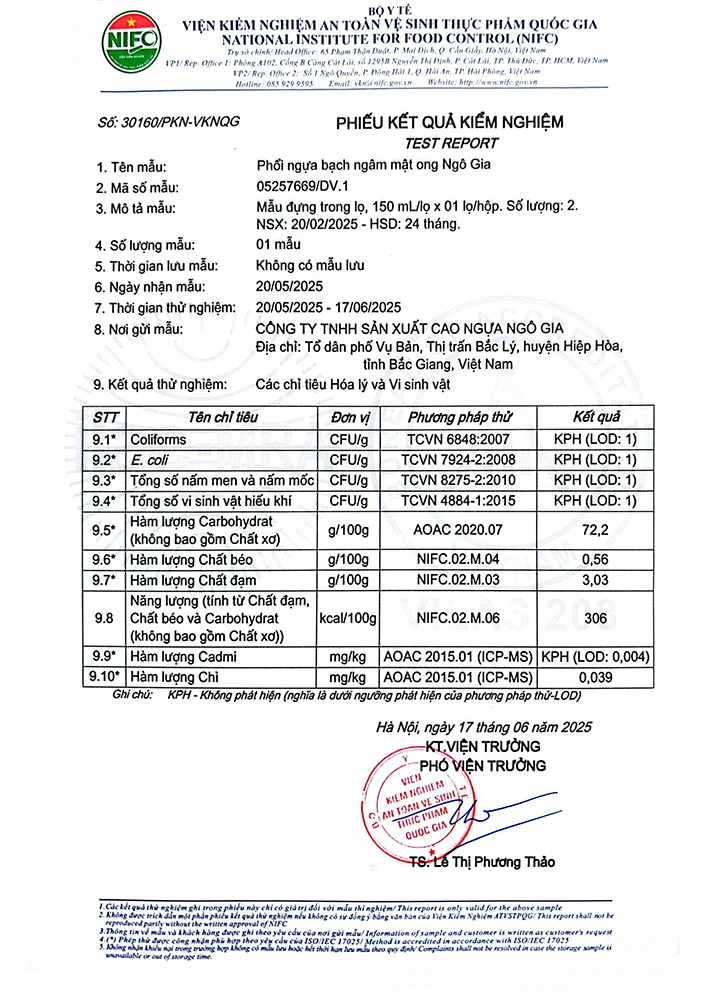 Sản phẩm được kiểm nghiệm, phân tích thành phần tại Viện Kiểm nghiệm An toàn Vệ sinh Thực phẩm Quốc gia.
